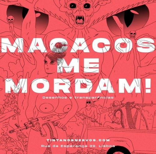 Na Tinta nos Nervos, apresentam-se quatro conjuntos distintos de trabalhos que partilham o mesmo vocabulário e essa mesma força das imagens. Um primeiro que dispõe séries de desenhos avulso ou pertencentes à mesma história, esgalhados a caneta carioca de cor preta num gozo quase pueril do inventar histórias e personagens que incorporam o fascínio pelos filmes série B ou as histórias de índios e cowboys.