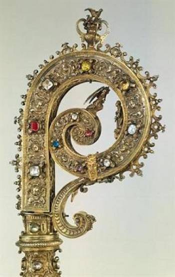 Báculo de extraordinária perícia no trabalho da prata, em que os típicos motivos de ferroneries e enrolamentos se expandem de uma forma tão profusa por toda a peça que não deixam qualquer espaço livre. Uma peça do Museu Nacional de Arte Antiga.