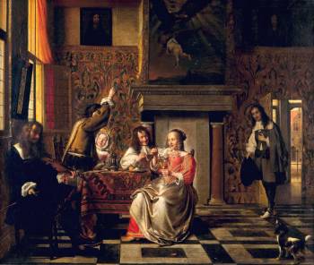 Obra de referência da coleção de pintura holandesa do Museu Nacional de Arte Antiga, e uma das mais representativas deste contemporâneo de Vermeer, o significado da composição supera a mera representação de uma cena galante do quotidiano de Amesterdão pelos meados do século XVII.