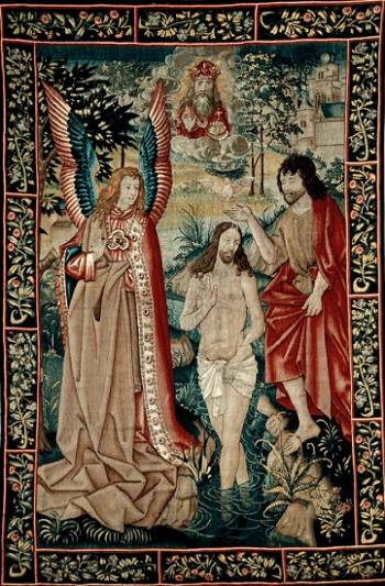 Certamente inspirada nas pinturas flamengas do século XV, esta tapeçaria apresenta um esquema de composição habitual nesta época: Cristo, de pé nas águas do rio Jordão, entre São João Batista e o Anjo, a representação do Pai Eterno e do Espírito Santo, sob a forma de pomba. Uma peça do Museu Nacional de Arte Antiga.