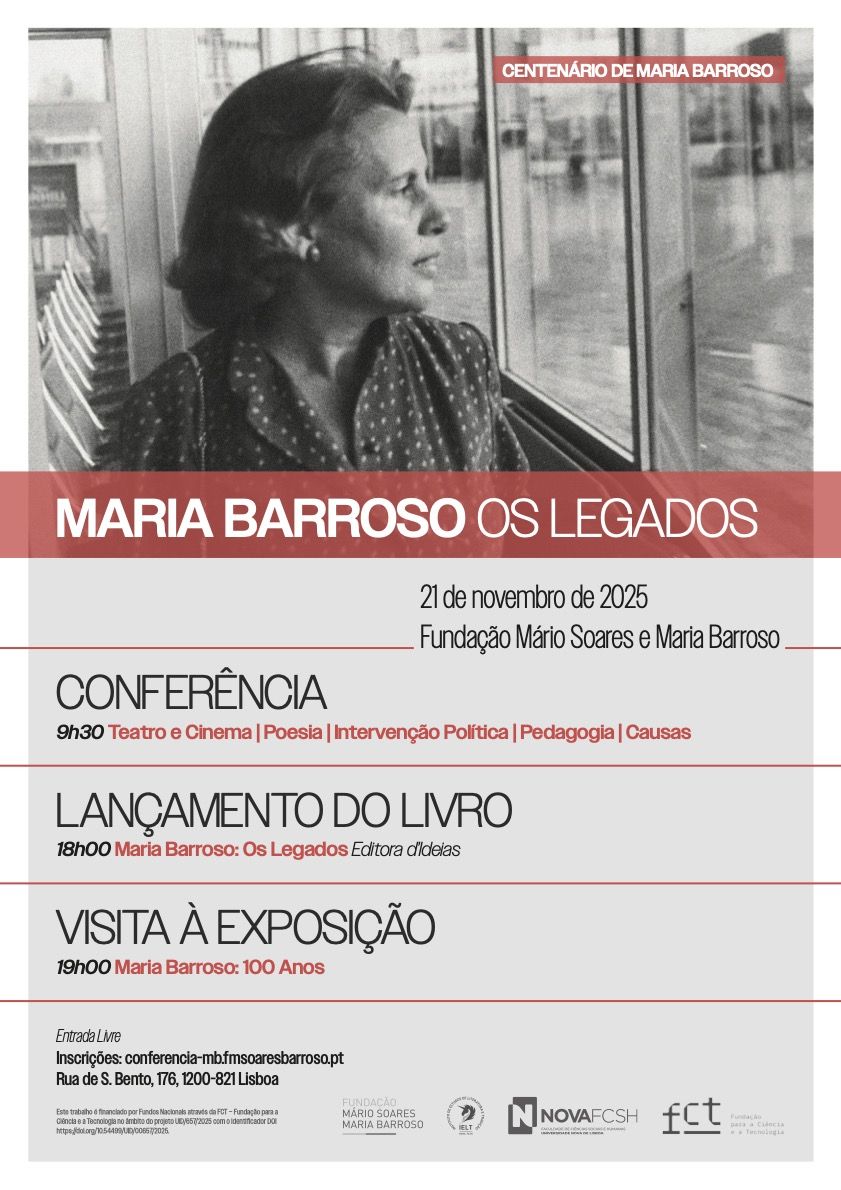 Sessão comemorativa do Centenário de Maria Barroso, na Fundação Mário Soares e Maria Barroso, no dia 21 de novembro de 2025, a partir das 9h30.