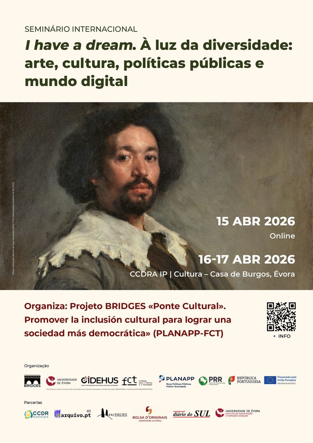 O seminário “I have a dream. À luz da diversidade: arte, cultura, políticas públicas e mundo digital” será inaugurado pelo Comissário do Plano Nacional das Artes -PNA- Paulo Pires do Vale, online no dia 15, às 10h30. Ao longo de três dias de encontro, serão proferidas conferências e apresentadas prácticas artísticas que demostram as formas de promover a diversidade racial e cultural através da investigação, da educação ou da performance artística.
