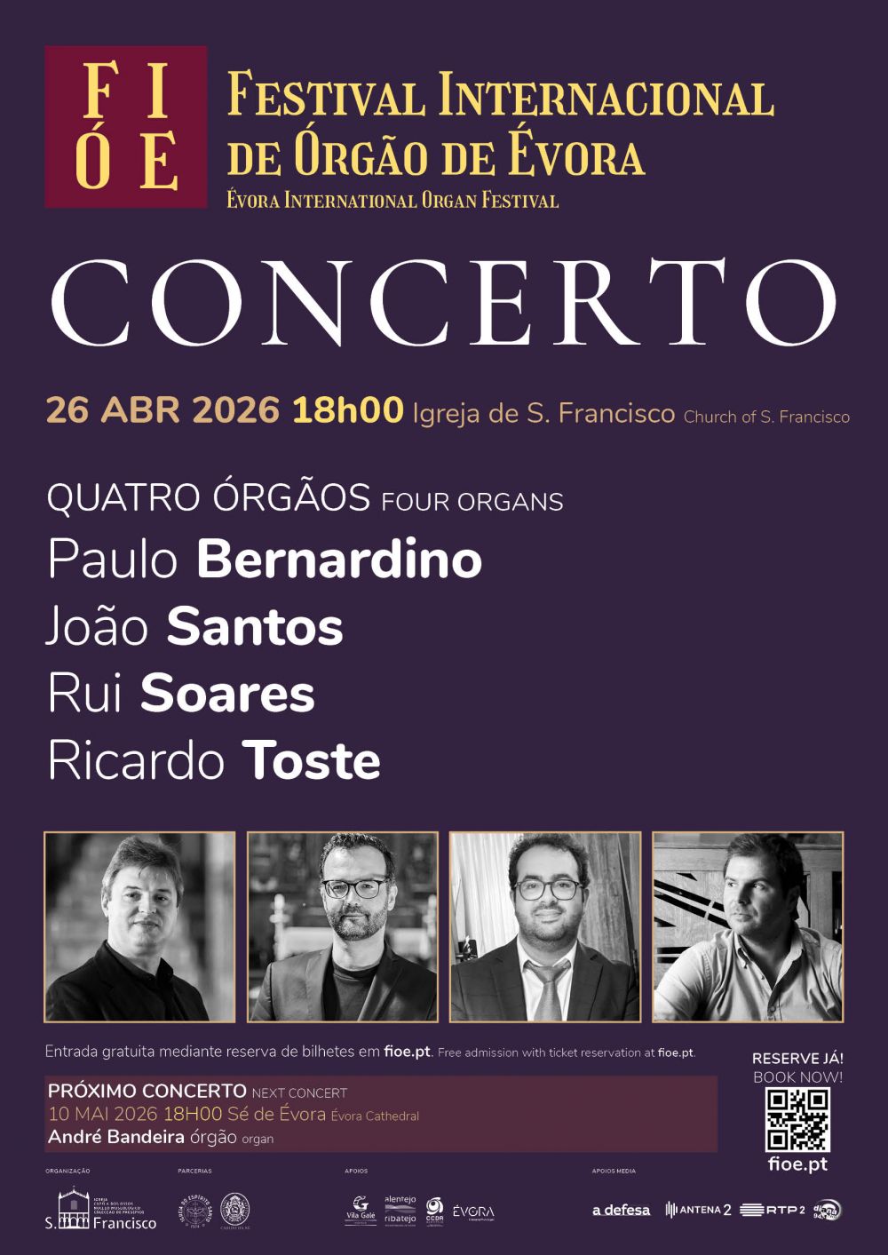 Da tradição à modernidade: Cristo e a espiritualidade franciscana. O concerto, com os organistas Paulo Bernardino, João Santos, Rui Soares e Ricardo Toste apresenta um programa que articula repertório dos séculos XVI ao XXI, explorando a relação entre escrita musical e a espacialização sonora.
