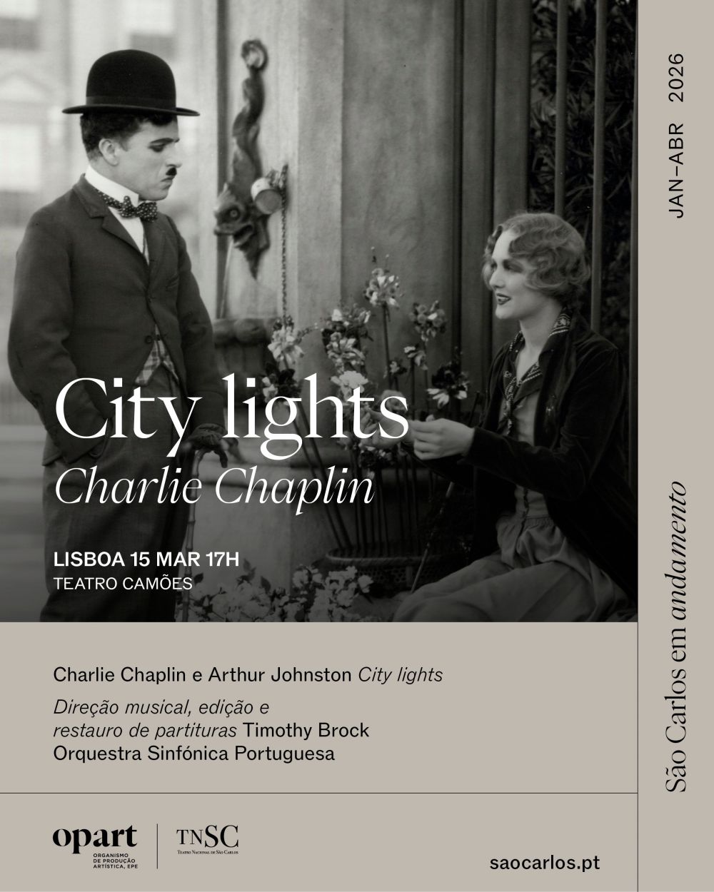 City lights, de Charlie Chaplin, com música ao vivo pela Orquestra Sinfónica Portuguesa, dirigida por Timothy Brock.
