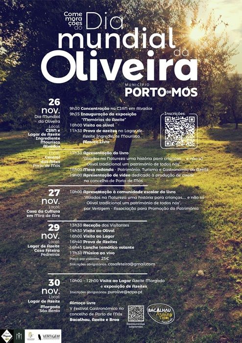 O Município de Porto de Mós celebra, entre 26 e 30 de novembro, o Dia Mundial da Oliveira, com um conjunto de iniciativas que destacam a importância cultural, histórica e económica da oliveira e do azeite no concelho.