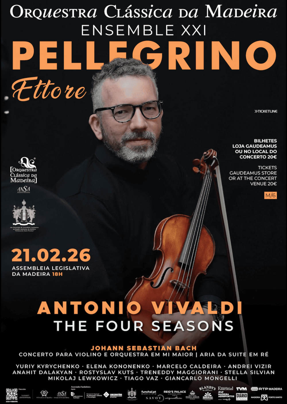 Neste concerto especial, o violinista Ettore Pellegrino interpreta uma das obras mais emblemáticas do repertório barroco: As Quatro Estações, de Antonio Vivaldi, um ciclo que continua a cativar gerações pela sua força imagética e pela sua energia vibrante.