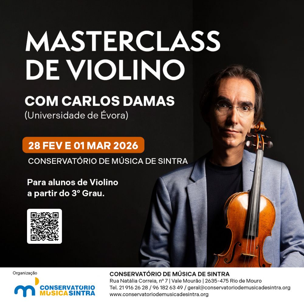 No fim de semana de 28 de fevereiro e 1 de março de 2026 convidamos o professor Carlos Damas (Universidade de Évora) para orientar uma Masterclass de Violino, dirigida a alunos a partir do 3º grau, quer do Conservatório de Música de Sintra, quer de outros conservatórios e academias.