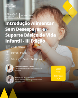 No próximo dia 21 de março, a SalusLive, centro de referência nacional na intervenção pediátrica, promove o workshop “Introdução Alimentar Sem Desesperar e Suporte Básico de Vida Infantil”, uma sessão formativa dirigida a pais, mães e cuidadores de bebés que pretendam adquirir conhecimentos essenciais para uma introdução alimentar segura, ao mesmo tempo que aprendem a agir em situações de emergência.