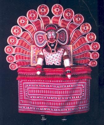 Utilizado no teatro ritual Teyyam, no sul de Karnataka e no Norte de Kerala, onde um dançarino, trajado e pintado, entra em transe e encarna um deus que representa o seu próprio mito de origem e os seus feitos, permitindo aos fiéis consultarem-no.
