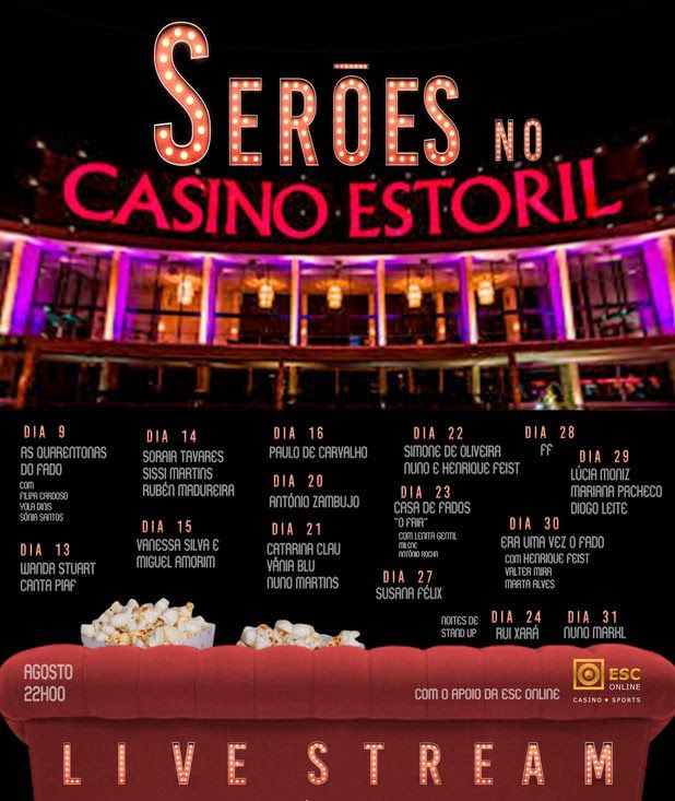 O Auditório do Casino Estoril volta a abrir as portas para a realização de espetáculos em live stream! “Serões no Casino Estoril” é uma alternativa para não deixarmos a cultura parada, dadas as circunstâncias atuais e as limitações. De 9 a 31 de agosto, de quinta-feira a domingo, pelas 22 horas, teremos 45 minutos a 1 hora de concertos e comédia, sendo apresentados em direto e "ao vivo e a cores”. Mas não será só o Auditório o cenário destas noites. O Foyer do Salão Preto e Prata também será palco destes serões, tendo como fundo os jardins do casino e o mar.