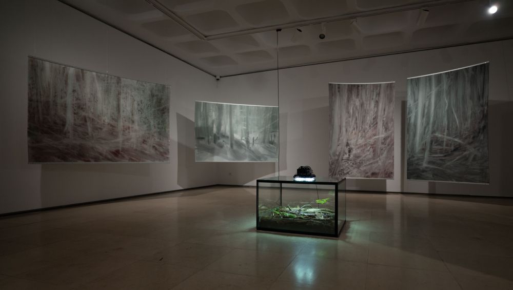 Exposição com 19 aguarelas sobre papel, 100% Algodão, 356g Arches, Sem titulo (A vida sensível), 2021, 4 terrários nativo (serra de Sintra), Natureza Contida, I II, III, IV, 2021, caixa de vidro duplo, alumínio e silicone e um vídeo "Ser", 2021, color, 2:1, 4k (3840x1920), loop 15’ 48’’