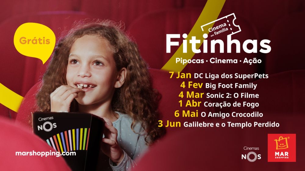 O regulamento de acesso às sessões gratuitas de cinema infantil “Fitinhas” pode ser consultado nos balcões de informações do MAR Shopping Algarve e do MAR Shopping Matosinhos ou no website dos meeting places.