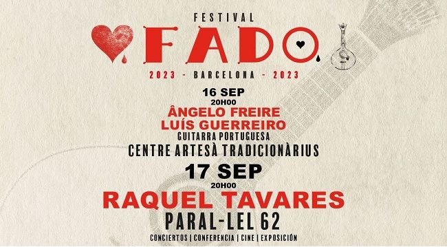 O Festival Fado Barcelona acontece este ano no dias 16 e 17 de setembro no Centre Artesà Tradicunàrius e Paral- Lel 62 com a presença da dupla Ângelo Freire e Luís Guerreiro na Guitarra Portuguesa no dia 16 de setembro e no dia seguinte ficará a cargo da Raquel Tavares para um grande concerto.