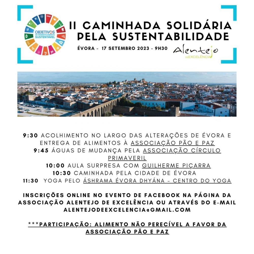 A Associação Alentejo de Excelência convida os eborenses a participar na II Caminhada Solidária pela Sustentabilidade. A iniciativa acontecerá em Évora no dia 17 de setembro e pretende ser uma chamada de atenção para a Agenda 2030 e os seus 17 Objetivos do Desenvolvimento Sustentável.