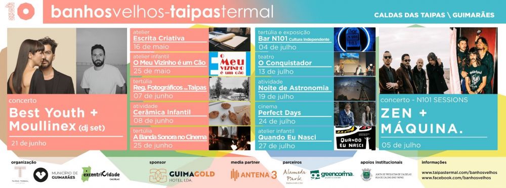 O espaço Banhos Velhos é uma marca identitária e histórica na vila das Caldas das Taipas, em Guimarães, desde 1753. Após a sua restauração em 2010, tornou-se num espaço de cultura e lazer, onde a história se funde com a cultura e o património. Seguindo o modelo adotado o ano passado, o evento reforça a sua aposta na programação musical, trazendo a palco em junho os espetáculos de Best Youth e Moullinex, em formato DJ Set, bem como ZEN e Máquina que atuam em julho. Já no mês seguinte, em agosto, os Conjunto Corona mostram-nos o seu mais recente álbum ESTILVS MISTICVS e a já tradicional Noite de Fados com o Grupo de Fados da Vila volta a merecer destaque. Para encerrar a temporada musical de 2024, em setembro, o muito aguardado regresso de Capitão Fausto a Caldas das Taipas.